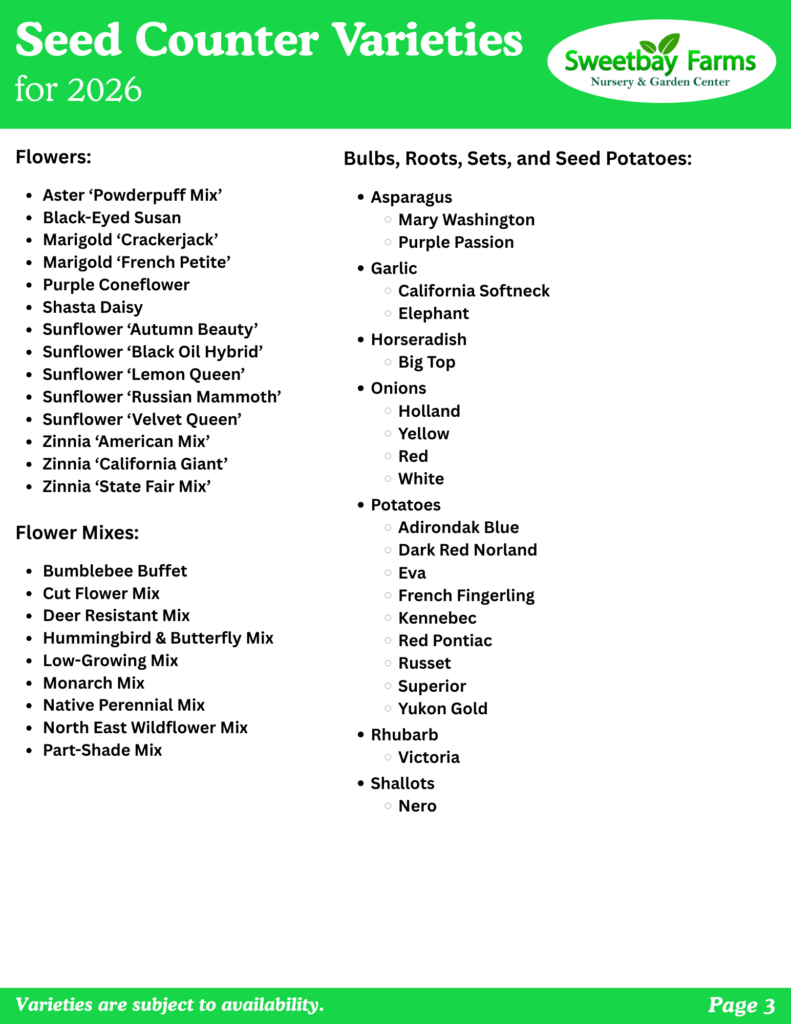 These seed varieties are expected to arrive in the spring of 2026. Please keep in mind exact inventory and availability may fluctuate throughout the season. This list is purely a guide so please call or visit the nursery to ensure stock of a desired variety.