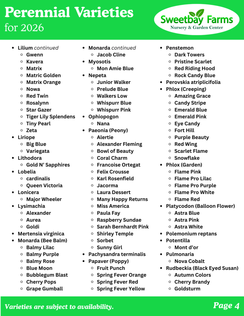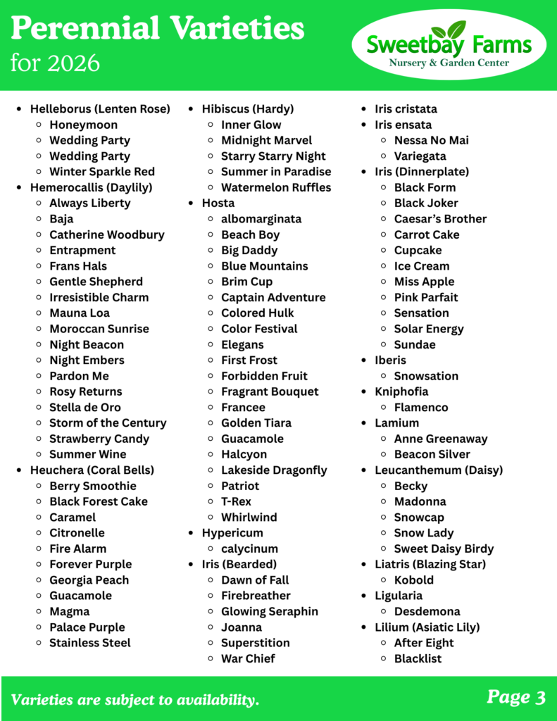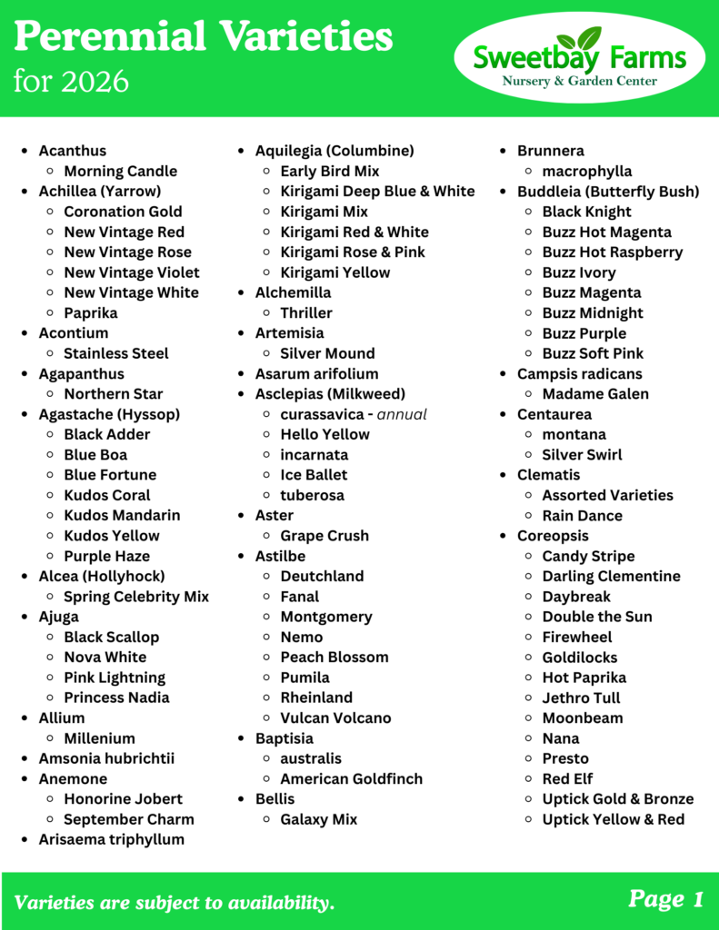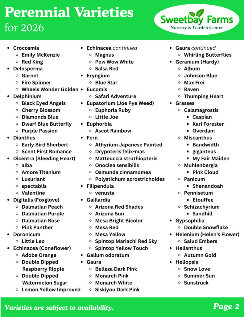 These perennial varieties are expected to arrive in the spring of 2026. Please keep in mind exact inventory and availability may fluctuate throughout the season. This list is purely a guide so please call or visit the nursery to ensure stock of a desired variety.